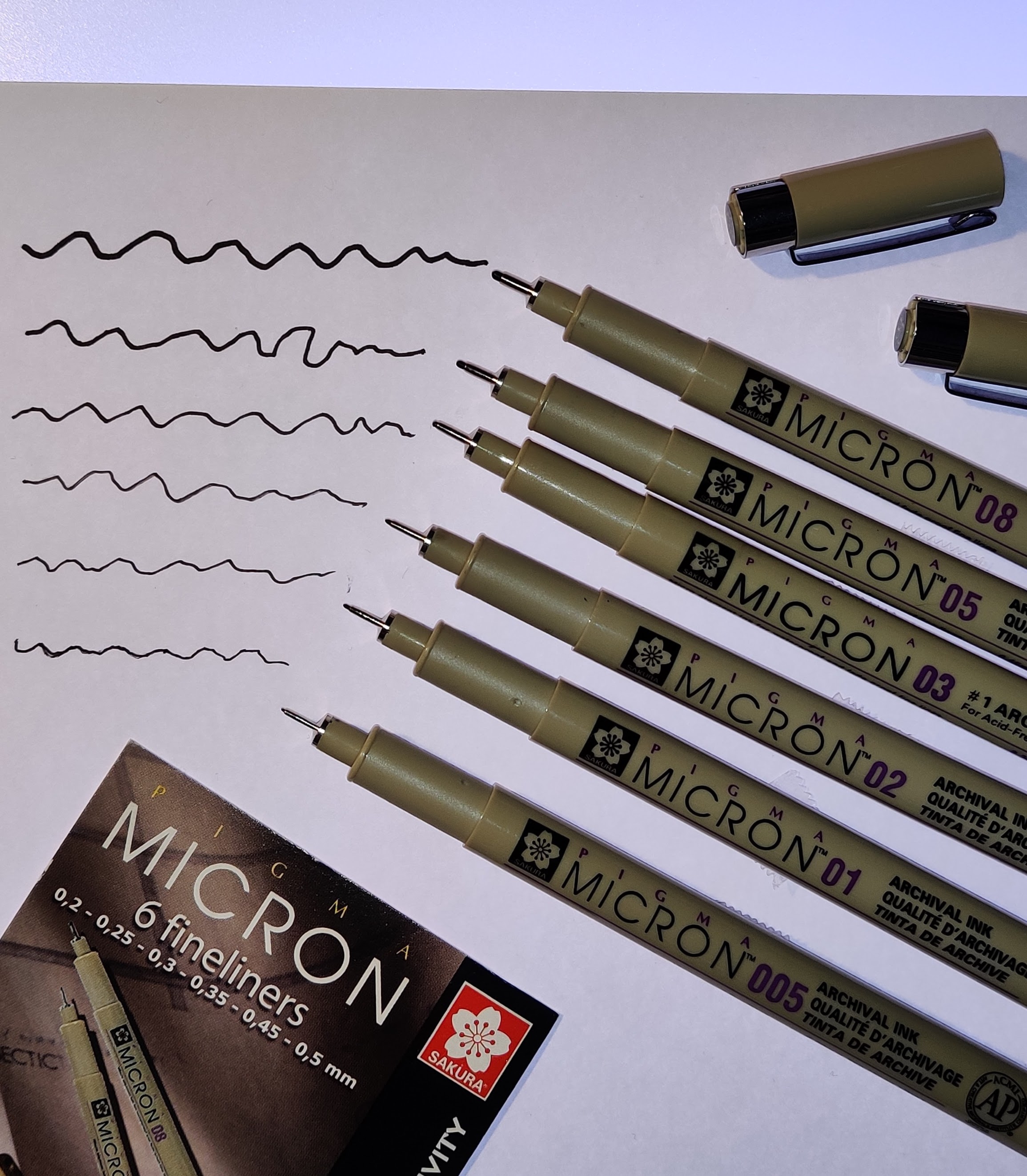 Kuvassa Sakura Pigma Micron -pakkaus, jossa on 6 eripaksuista tussia. Tällä pakkauksella pärjää pitkälle ja niitä löytyy helposti kirjakauppojen valikoimista tai nettikaupoista.