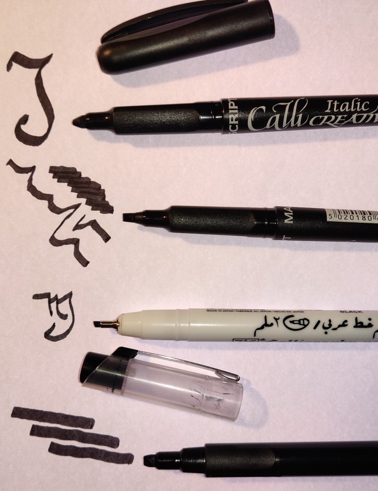 Kokeilemisen arvoinen tussi ääriviivojen tussaukseen on myös kuitukärkinen kalligrafiatussi. Kuvan valkoisessa tussissa (Kuretake Calligraphy pen 2.0) on viistokärki ja mustissa tusseissa tasakärjet (Manuscript Italic Callicreative ja Calligraphy -sarjojen tusseja).