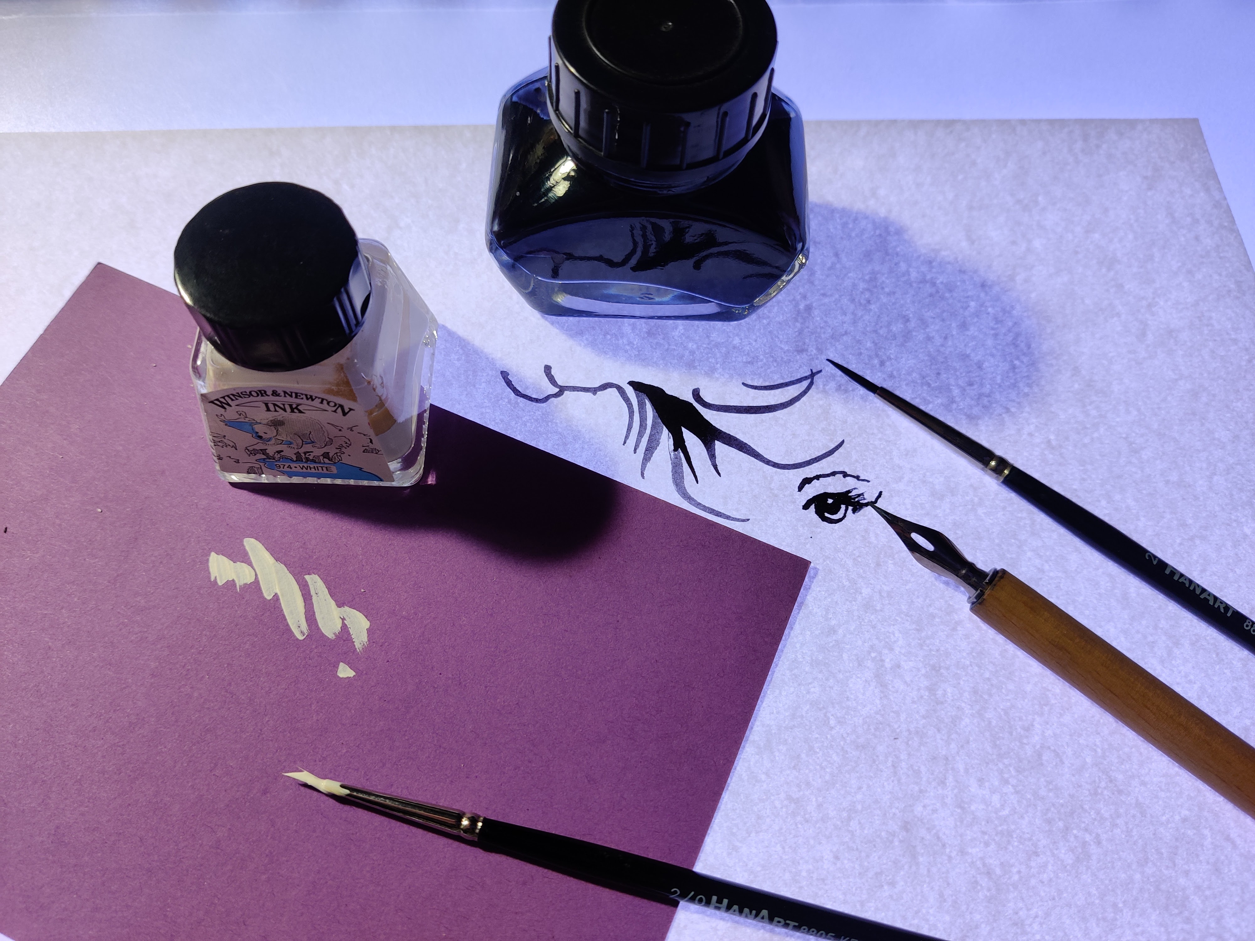 Tussilla tai musteella voi piirtää myös käyttäen sivellintä. Sivellin kannattaa oman työnsä viivojen ja pintojen mukaan. Siveltimellä on myös helppo tussata piirroksen suuria mustia alueita. Kuvassa on näkyvissä myös pieni pullo Winsor & Newton Ink:n valkoista mustetta.